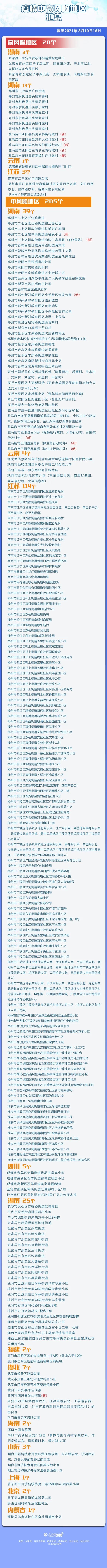截至8月10日16时,全国有20个高风险地区,205个中风险地区。防控勿松懈!