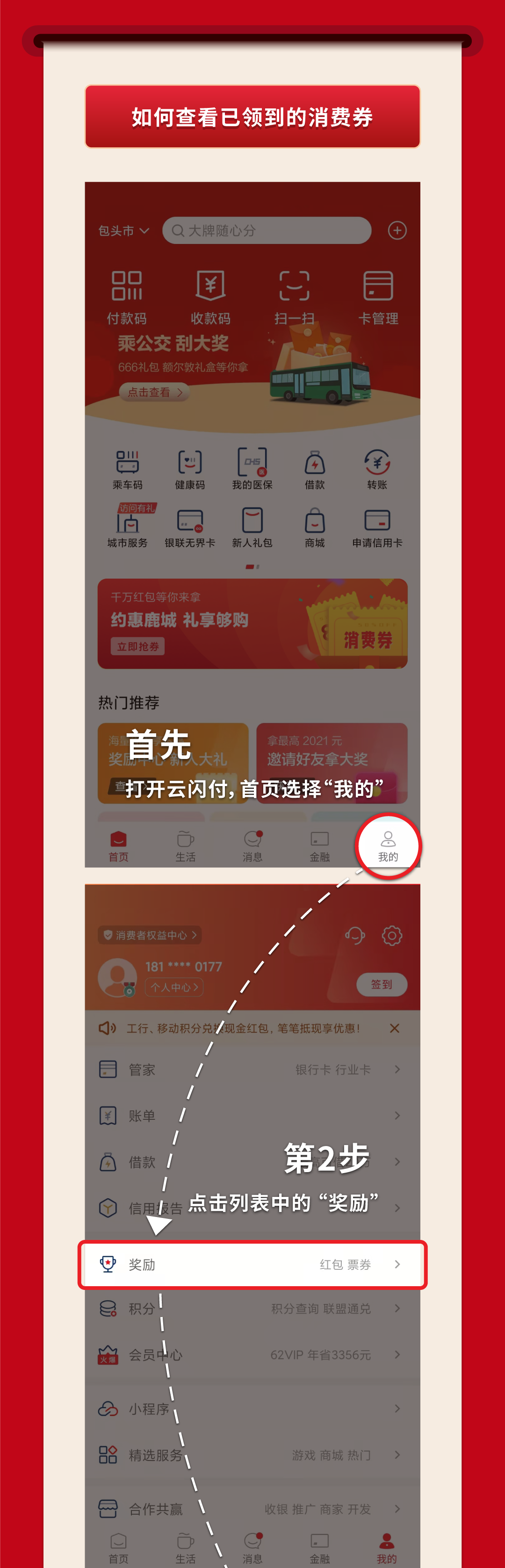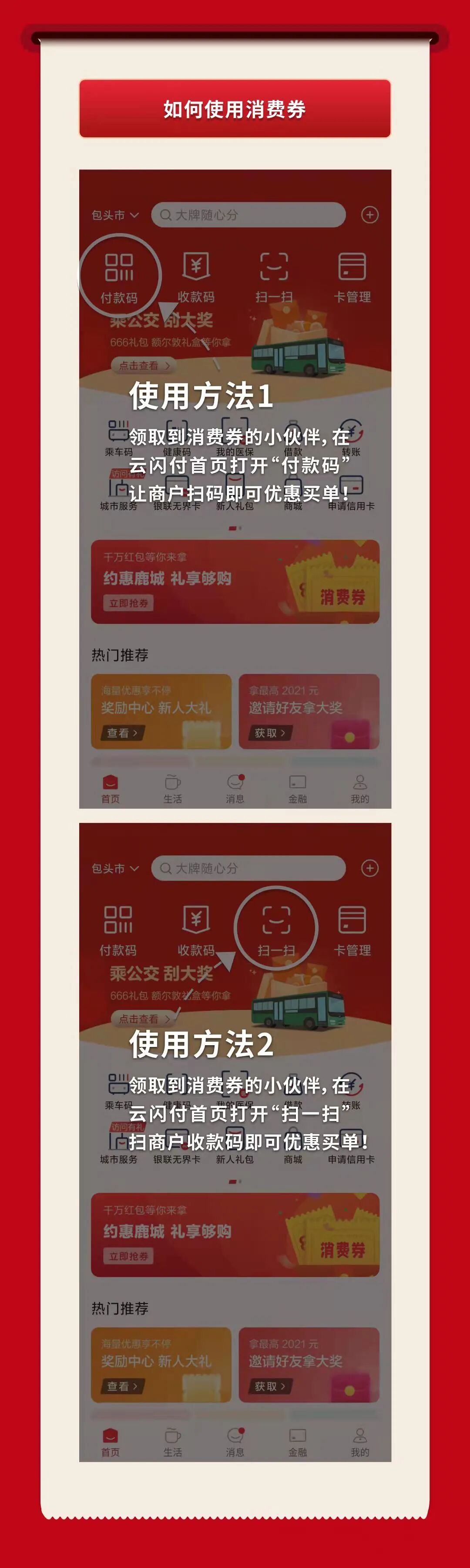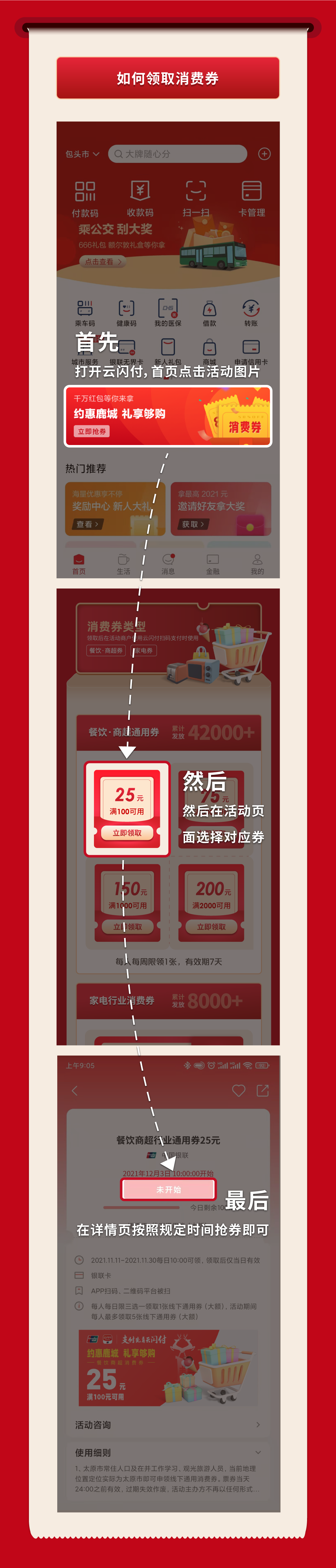 “云闪付”下载并注册成功后,请参考下图领取消费券↓↓↓