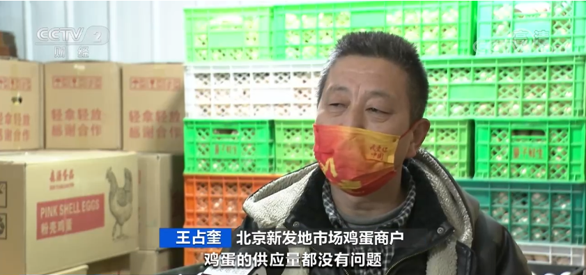 北京新发地市场鸡蛋商户王占奎:一斤4.6元左右,降了几角,鸡蛋的供应量没有问题。