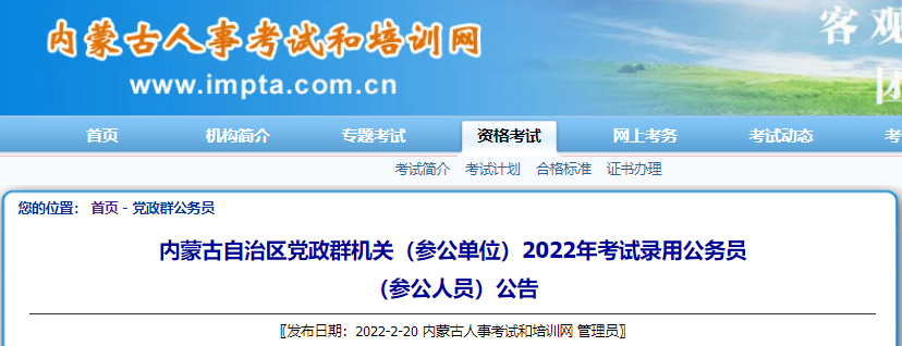 根据工作需要,决定组织实施内蒙古自治区党政群机关2022年度考试录用公务员工作。招考简章和招考职位详情拟于近期在内蒙古人事考试和培训网(http://www.impta.com.cn)上发布。报考者请关注内蒙古人事考试和培训网,登陆该网站进行报名。