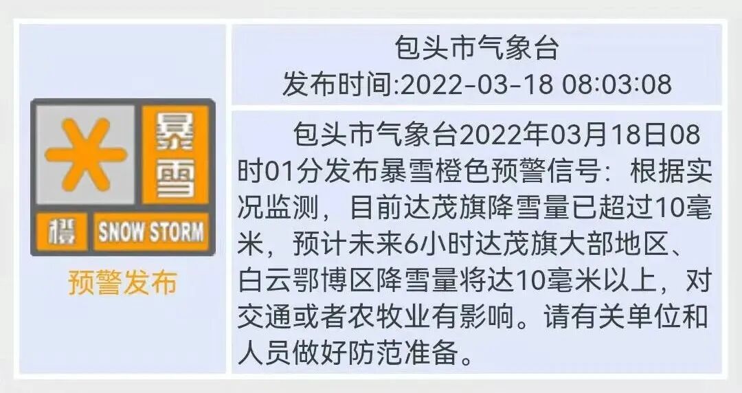 3月18日08时01分,365bet取款要多久到账_bat365bet_365bet网站哪个是真的市气象台发布了暴雪橙色预警信号,根据实况监测,目前达茂旗降雪量已超过10毫米,预计未来6小时达茂旗大部地区、白云鄂博区降雪量将达10毫米以上,对交通或者农牧业有影响。