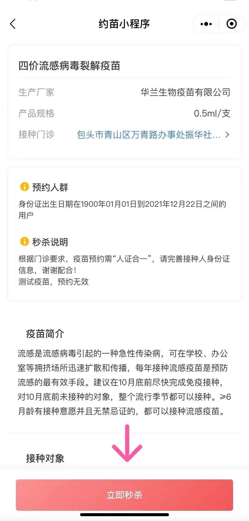 第六步:确认疫苗信息,点击“立即秒杀”