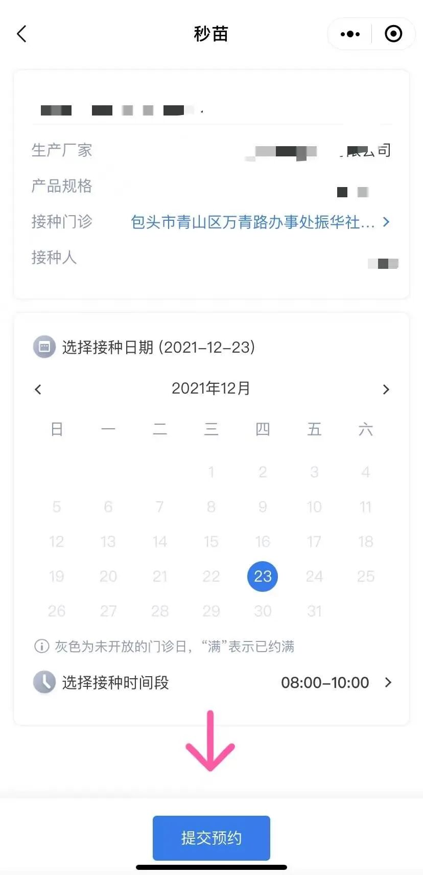 第八步:选择预约日期及接种时间,点击“提交预约”