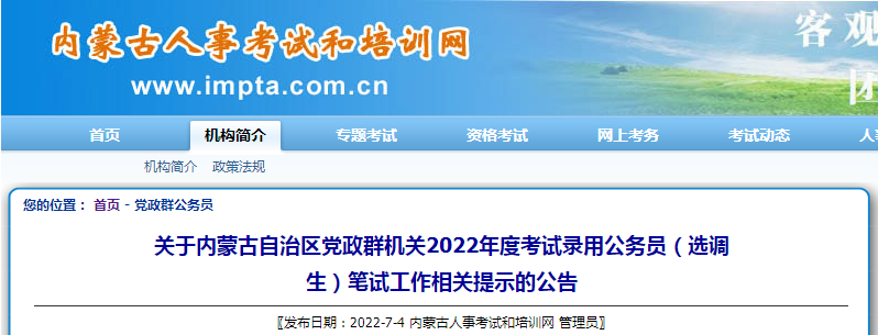 关于内蒙古自治区党政群机关2022年度考试录用公务员(选调生)