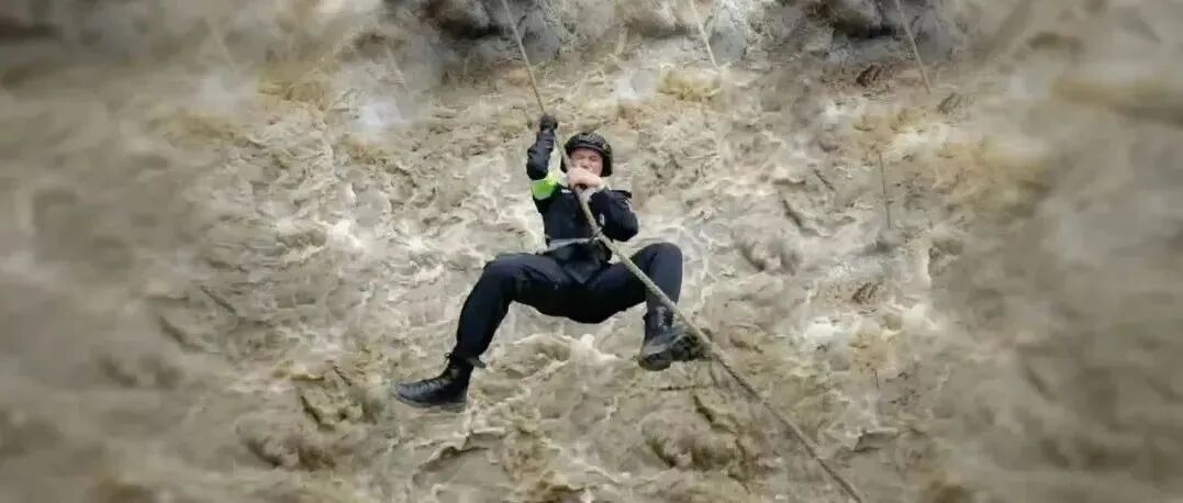 ▲5日,甘孜特警在震区开展救援时被一条湍急的河流拦住去路。危急时刻,特警们用身体和绳索搭建桥梁,转移被困群众900余人。