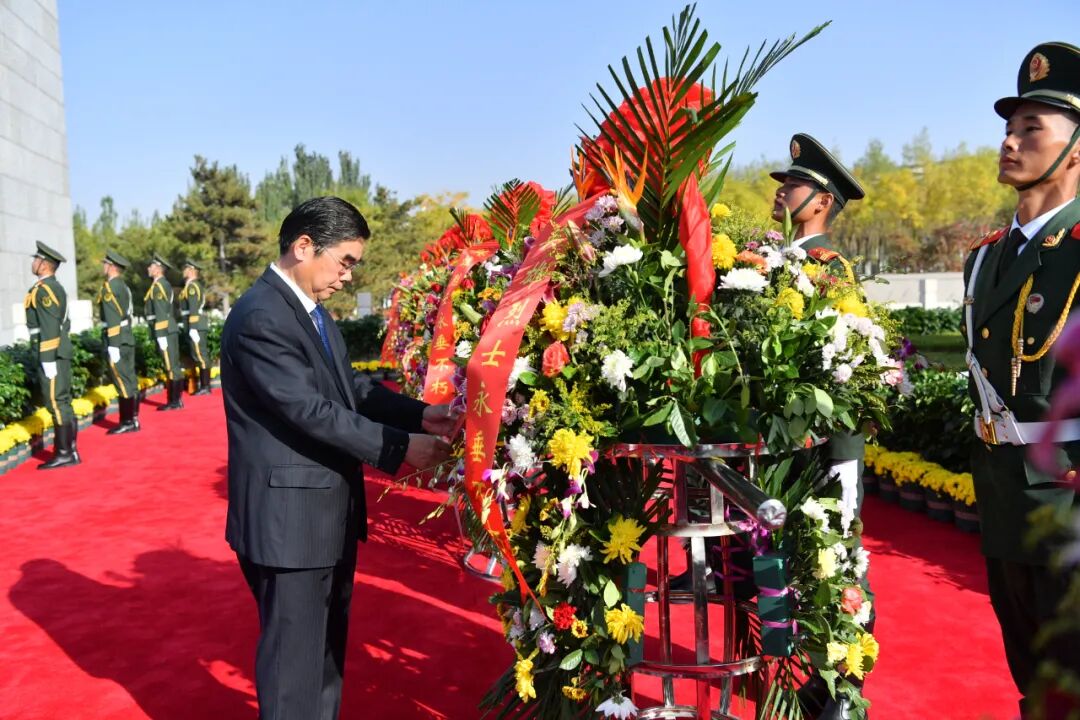 9月30日,我市举行烈士纪念日公祭活动,市委书记丁绣峰仔细整理花篮缎带。