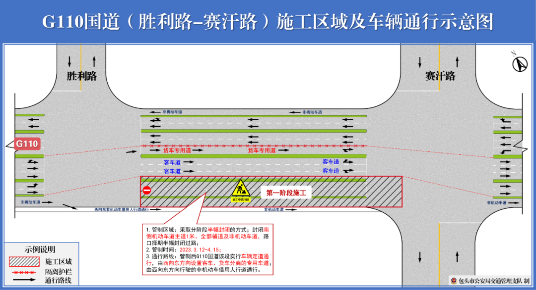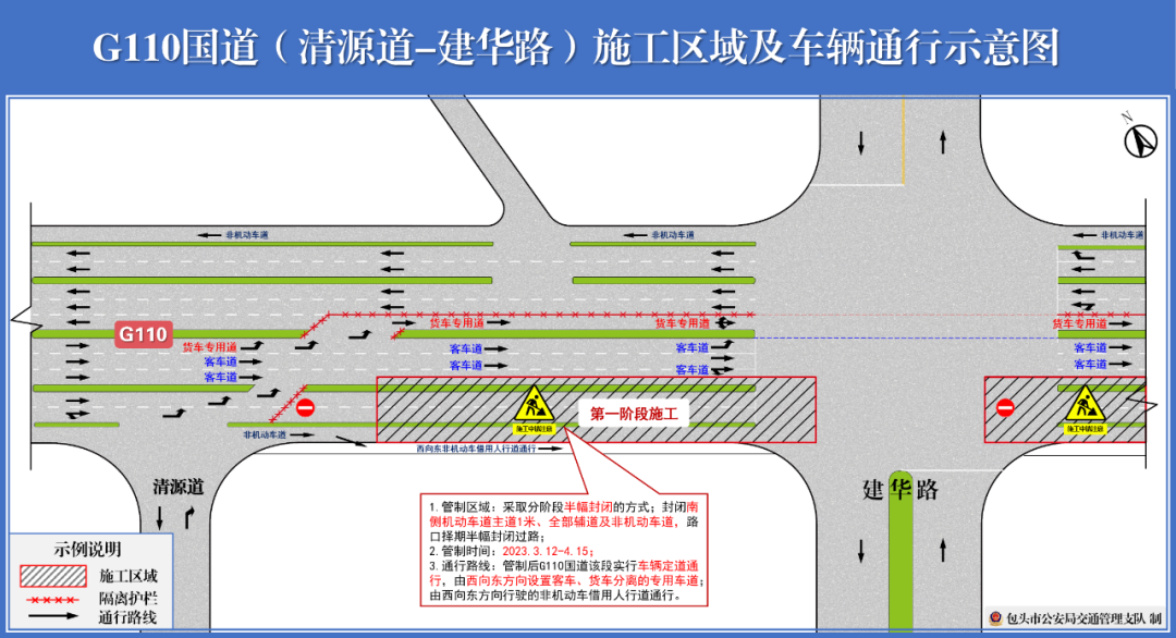 3.通行路线:管制后G110国道该段实行车辆定道通行,由西向东方向设置客车、货车分离的专用车道;由西向东方向行驶的非机动车借用人行道通行。
