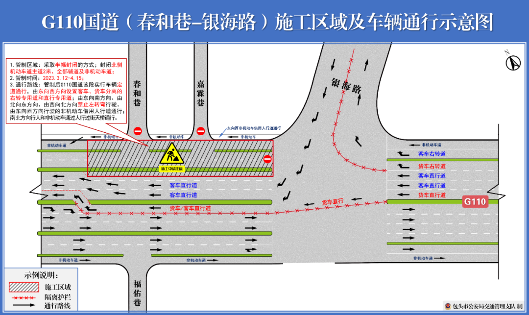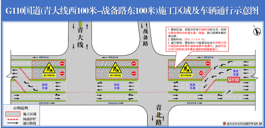 3.通行路线:管制后G110国道该段由东向西方向行驶的机动车需在道路南侧主道通行,由西向东方向行驶的机动车需在道路南侧辅道通行。