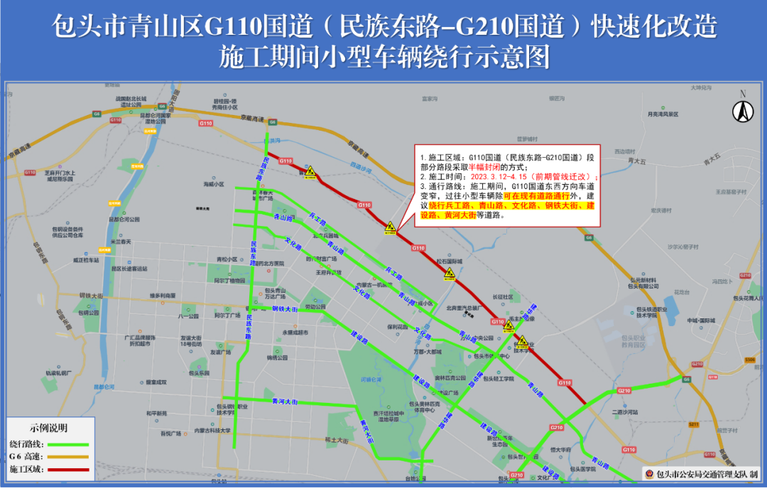 过往小型车辆除可在现有道路通行外,建议绕行兵工路、青山路、文化路、钢铁大街、建设路、黄河大街等道路。